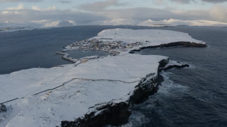 There is only one settlement on the island, also called Nólsoy, on the north-west coast on the Stongin peninsula which is attached to the rest of the island by a metres-wide isthmus.