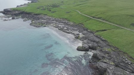 Rituvík is an outlying village from Toftir and was established in 1873. The village currently has 317 inhabitants. The village lies in an inlet facing the open sea, where surf often crashes against the shore. There is a landing site and boat houses on both sides of the inlet. When the weather is good, it is an excellent place to dive in the water off the village where there is a kelp forest with sandy patches on the seabed and underwater caves. Glyvrafjall north of Rituvík rises 303 m. On the beach, a rare geological phenomenon was formed by the filling of a lava tunnel while the lava was still molten. The old path to the village of Lamba leads past the 220 kg stone, which the legendary hero Ole the Strong is said to have lifted.